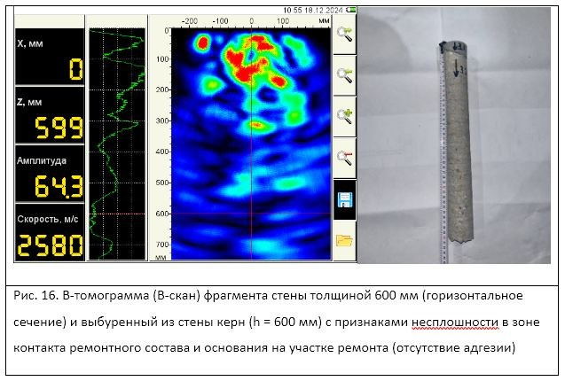 —в оставшихся зонах использовался ультразвуковой эхометод с применением ультразвукового низкочастотного томографа А1040MIRA. Для этого было выполнено обследование участков стен без ремонта с построением В-томограмм, которые принимались за эталонные и с ними сравнивались В-томограммы на участках ремонта. На отдельных участках с характерными типами полученных томограмм был выполнен отбор образцов-кернов и визуальное обследование зоны контакта ремонтного состава и основания, а также анализ томограмм, соответствующих данным участкам. Таким образом участкам с выявленными признаками отсутствия сплошности в зоне контакта ремонтного состава и основания на участке ремонта (по результатам визуального обследования образцов-кернов) соответствовали характерные В-томограммы, при получении которых участок ремонта также признавался бракованным.