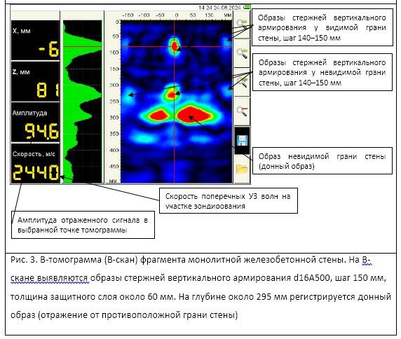 На рис. 2. и 3 представлены пример фрагмента монолитной железобетонной стены и ее томограмма типа В. Конструкция выполнена из бетона В30. Вертикальное армирование выполнено из арматуры d16A500 с шагом 150 мм, толщина защитного слоя 60 мм. Горизонтальное армирование выполнено из арматуры d10A500 с шагом 200 мм, толщина защитного слоя 40 мм. Толщина стены 300 мм.