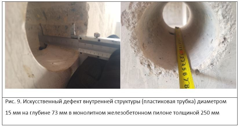 Фотографии участка пилона с выбуренным образцом-керном с включением цилиндрического отражателя (пластиковая трубка) диаметром 15 мм на глубине 73 мм изображены на рис. 9.