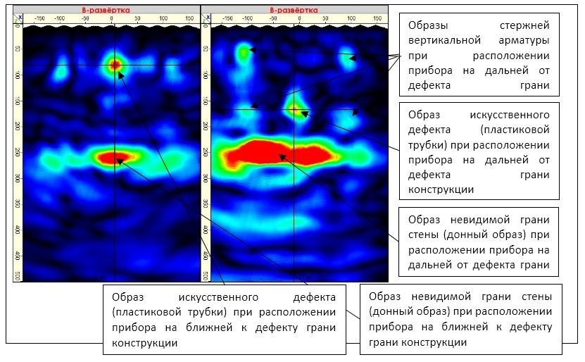В результате формируются визуальные образы отражателей, где разными цветами закодирована отражающая способность каждой точки визуализируемого объема. Зоны, где отсутствует отражение ультразвуковой волны, закрашиваются синим цветом, зоны, где присутствует отражение, закрашиваются видимым спектром от желтого до красного цвета в зависимости от амплитуды фиксируемых сигналов. Чем выше амплитуда, тем цвет ближе к красному. Отражателями в бетоне являются: элементы арматурного каркаса (арматурные стержни, другие закладные детали) и дефекты бетона — трещины, объемные пустоты и др. С помощью программного обеспечения сопоставляются видимые образы и их координаты с конструктивными элементами объекта контроля и выделяются зоны несовпадения, которые определяются как дефектные.