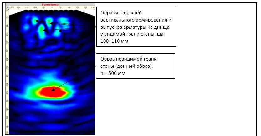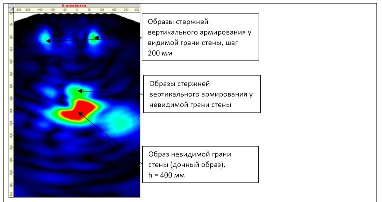 Особенностями В-томограмм (В-сканов) участков стен, где по результатам бурения образцов-кернов было подтверждено сцепление торкрет-бетона с основанием, являются наличие образа невидимой грани стены (донный образ) и образов стержней вертикального и горизонтального армирования (при горизонтальном или вертикальном расположении томографа соответственно).