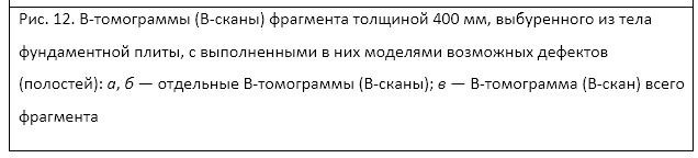 В примере на рис. 11 рассмотрен фрагмент толщиной 400 мм, выбуренный из тела фундаментной плиты с выполненными в нем моделями возможных дефектов (полостей).