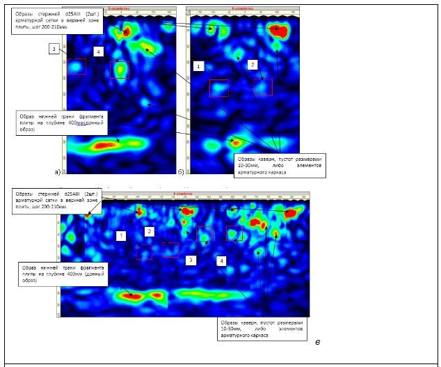 Следует отметить, что определение линейных размеров дефектов внутренней структуры бетона, а также параметров армирования по томограммам, получаемым при зондировании фрагмента железобетонной конструкции, без их привязки к фактическим размерам, будет содержать некоторую погрешность, тем большую, чем менее однородный бетон на участке зондирования.