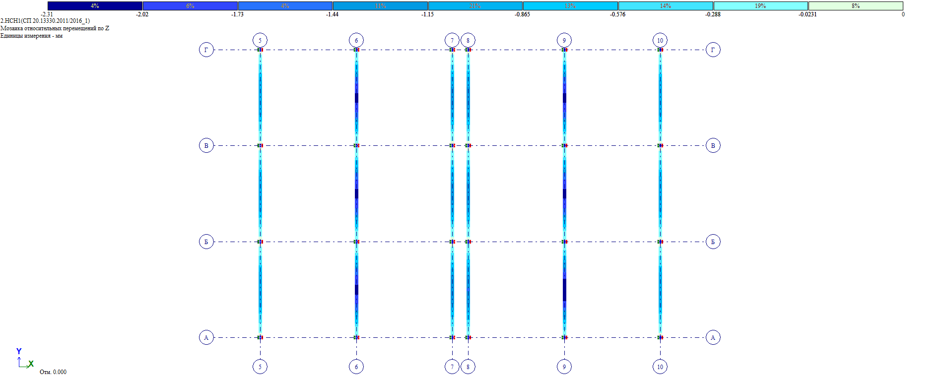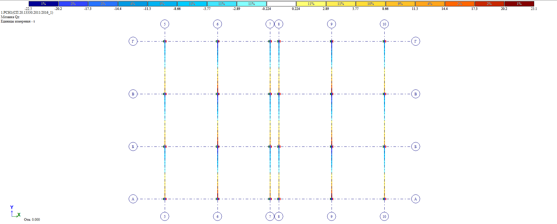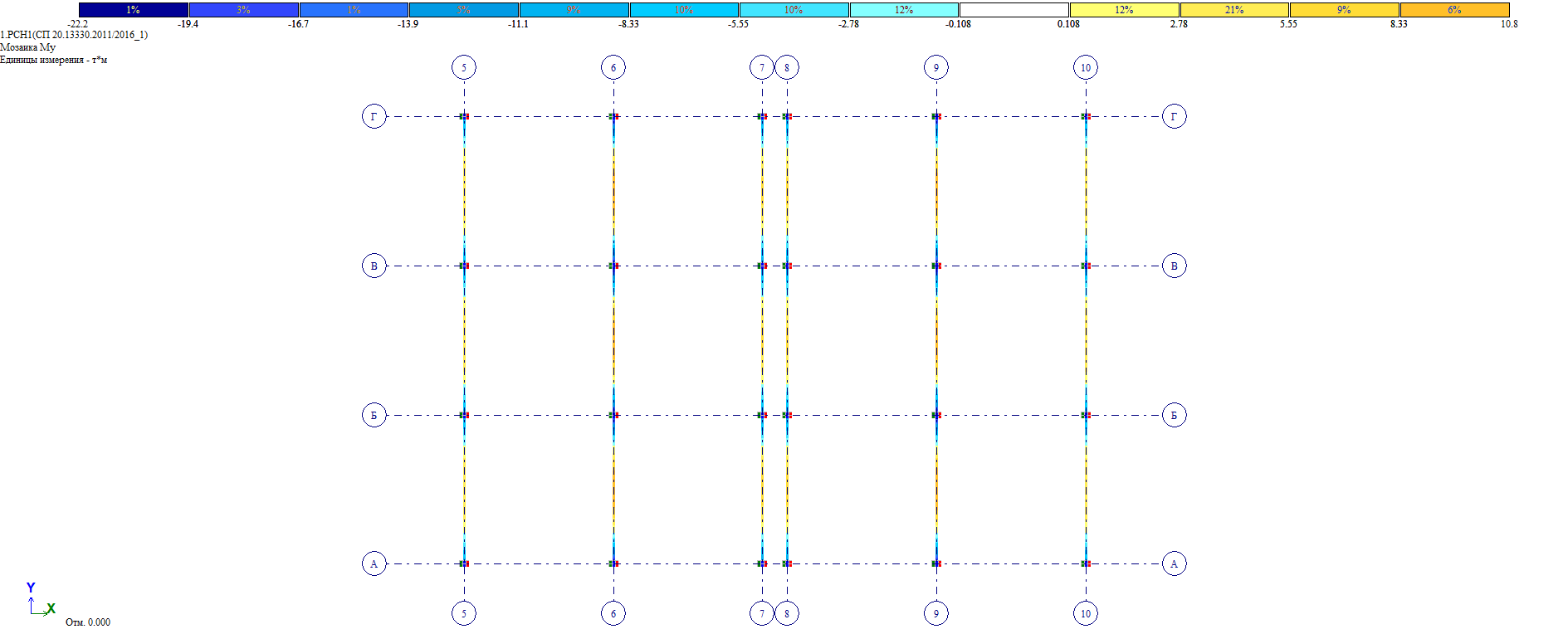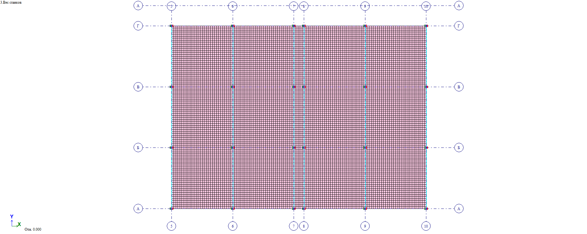 Расположение конечных элементов и геометрические параметры их сечений соответствуют фактическим параметрам несущих конструкций, определяемые в результате инструментального обследования.