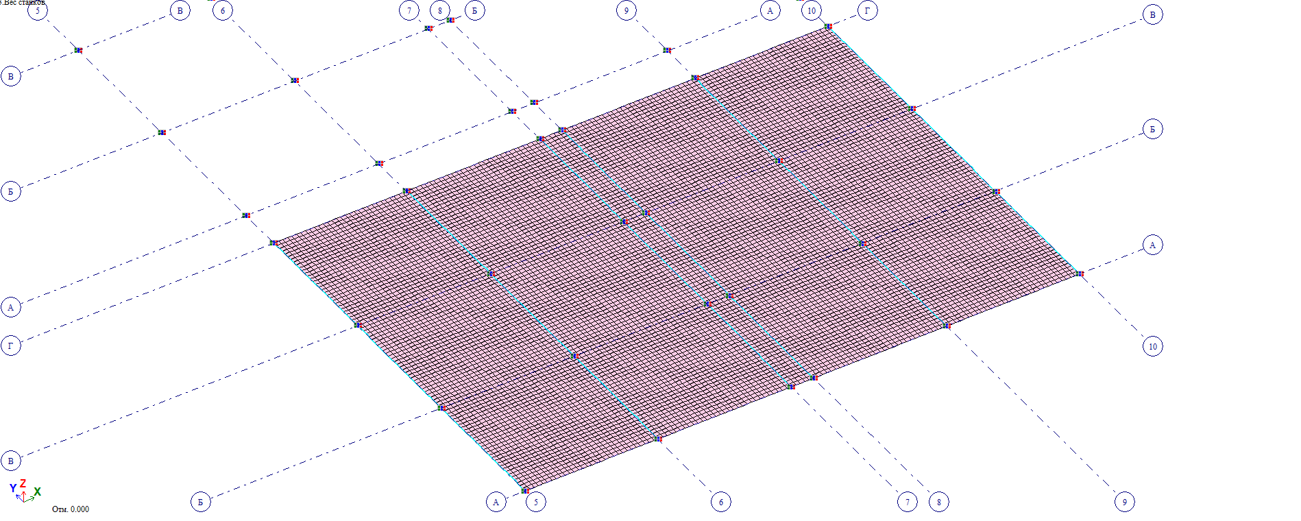 Плиты перекрытий заданы оболочечными конечными элементами (КЭ-44, КЭ-42). Все остальные конструкции (конструкции полов, стяжек, станок) учтены в расчет-ной схеме соответствующими нагрузками.